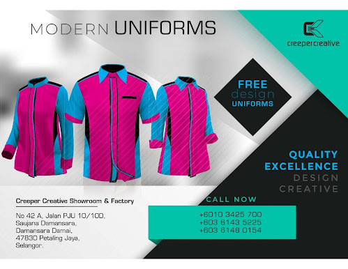 Creeper Creative adalah pengeluar dan pembekal seragam khas. Lebih 12 tahun pengalaman dalam menyelesaikan masalah tempahan seragam customade. Tiada masalah saiz dan pelanggan berpuas hati dengan fabrik dan reka bentuk mengikut cadangan yang telah dipersetujui.